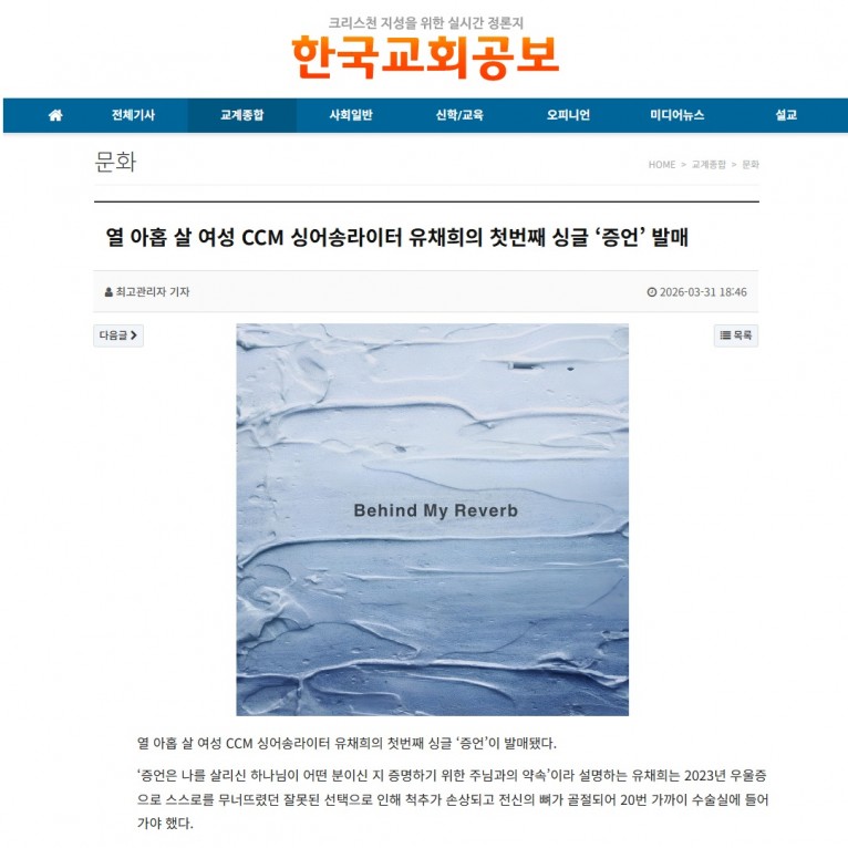 [기사] 열 아홉 살 여성 CCM 싱어송라이터 유채희의 첫번째 싱글 ‘증언’ 발매(한국교회공보)