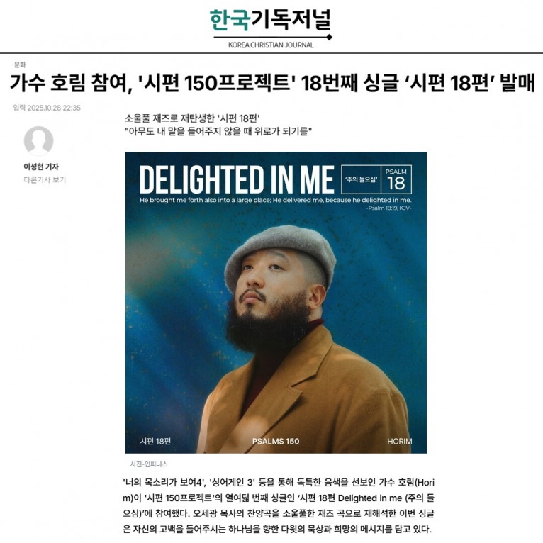 '너의 목소리가 보여4', '싱어게인 3' 등을 통해 독특한 음색을 선보인 가수 호림(Horim)이 '시편 150프로젝트'의 열여덟 번째 싱글인 ‘시편 18편 Delighted in me (주의 들으심)’에 참여했다. 오세광 목사의 찬양곡을 소울풀한 재즈 곡으로 재해석한 이번 싱글은 자신의 고백을 들어주시는 하나님을 향한 다윗의 묵상과 희망의 메시지를 담고 있다.