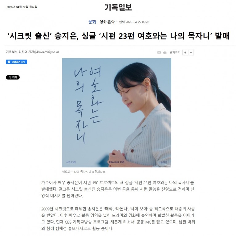 [기사] ‘시크릿 출신’ 송지은, 싱글 ‘시편 23편 여호와는 나의 목자니’ 발매(기독일보)